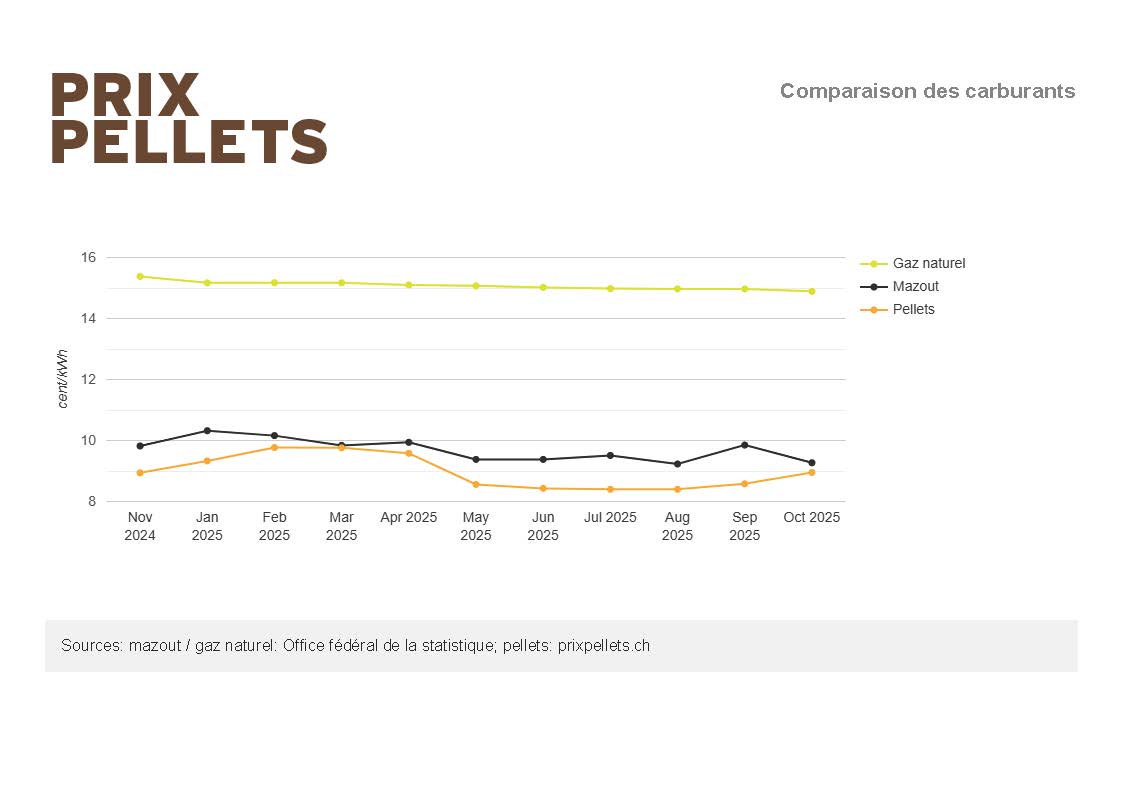 L’indice des prix des pellets de bois est établi par la plateforme neutre pelletpreis.ch et s’appuie sur les données de 22 fournisseurs de pellets en Suisse. Il présente les prix du mois en cours. L’évolution des prix et la comparaison des combustibles depuis 2008 sont disponibles sur le site Internet www.pelletpreis.ch