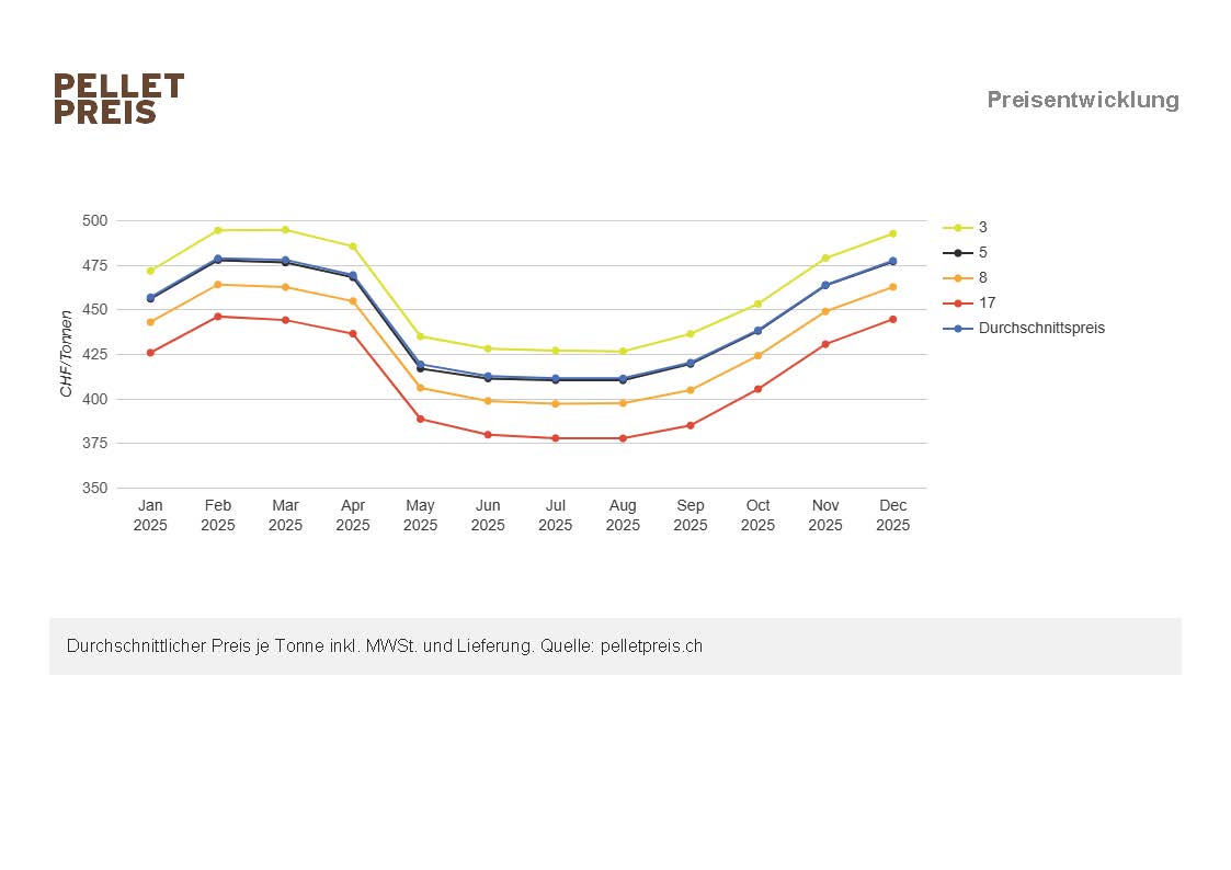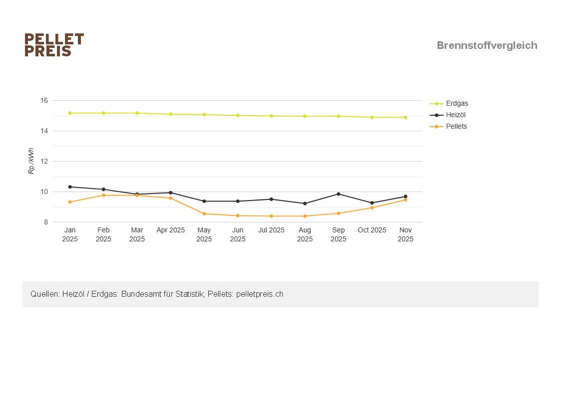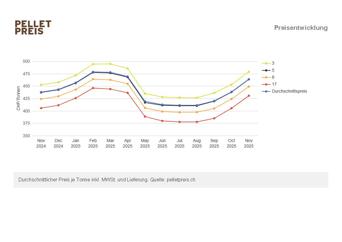 L’indice dei prezzi dei pellet di legno viene rilevato dalla piattaforma indipendente pelletpreis.ch e si basa sui dati raccolti da 22 fornitori di pellet in Svizzera. L’indice rappresenta il prezzo mensile aggiornato. Sul sito web www.pelletpreis.ch è possibile seguire l’andamento dei prezzi e visualizzare il confronto dei prezzi dei diversi combustibili dal 2008 a oggi.
